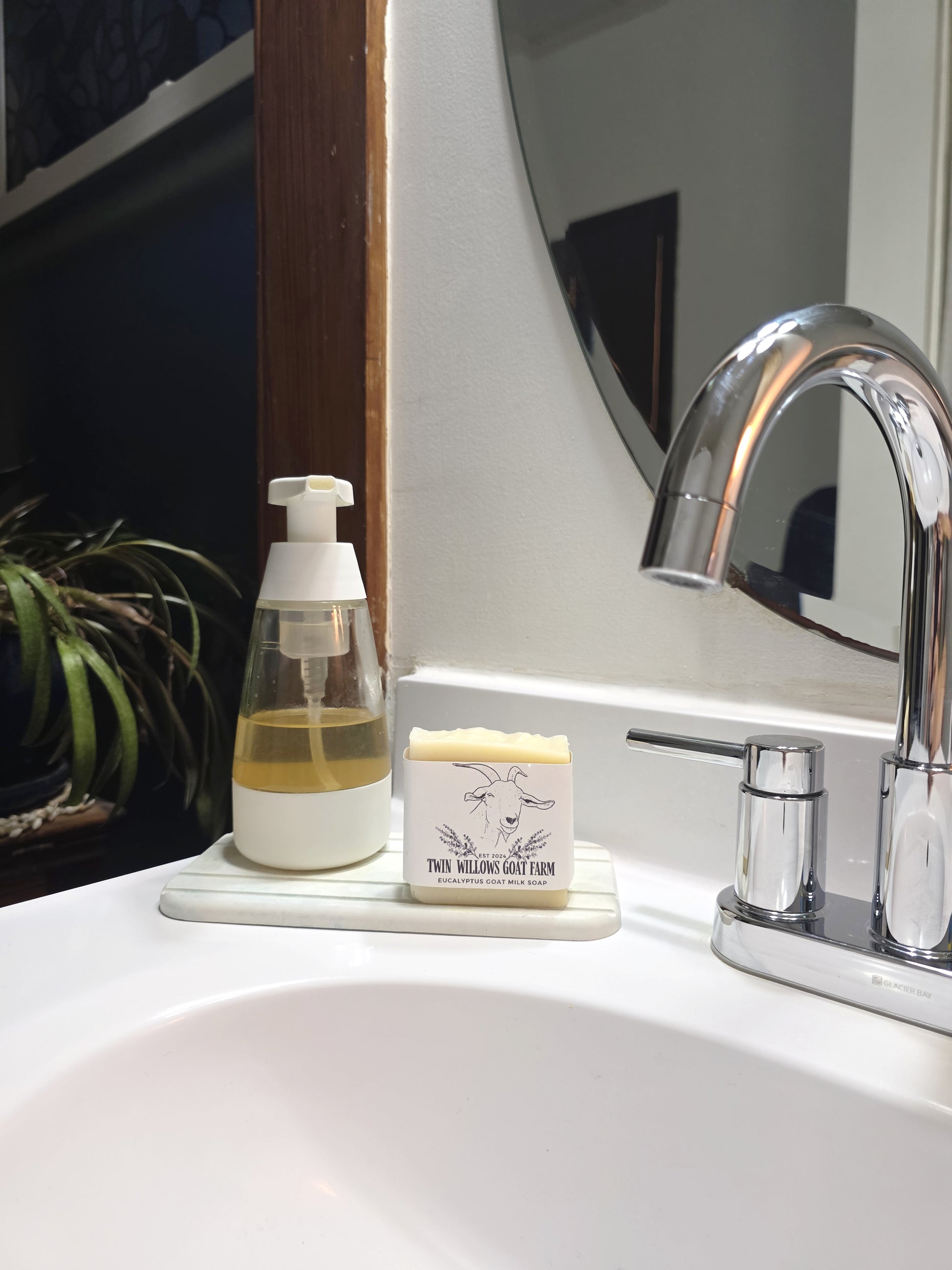 Made with: Goat Milk, Olive Oil, Coconut Oil, Sodium Hydroxide (lye), and Eucalyptus Essential Oil.
