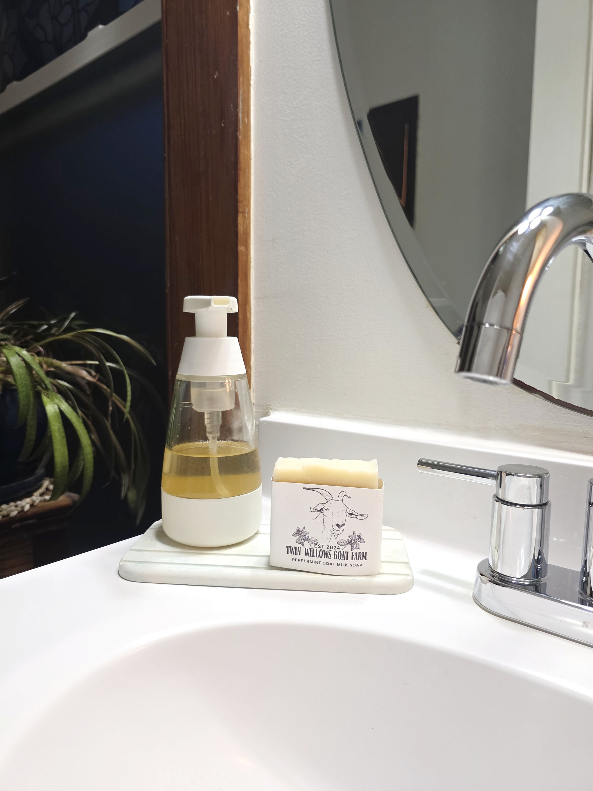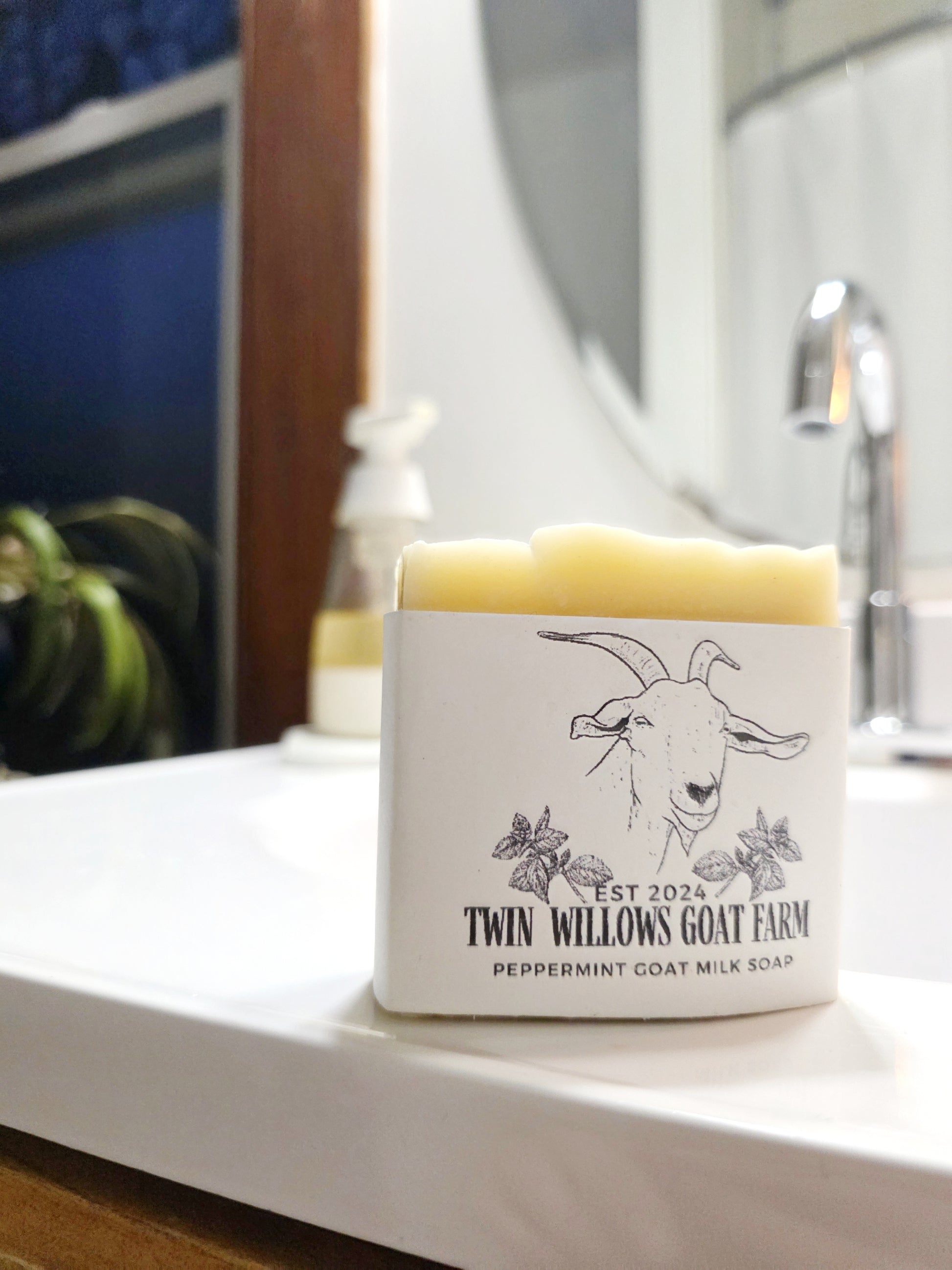Made with: Goat Milk, Olive Oil, Coconut Oil, Sodium Hydroxide (lye), and Peppermint Essential Oil.
