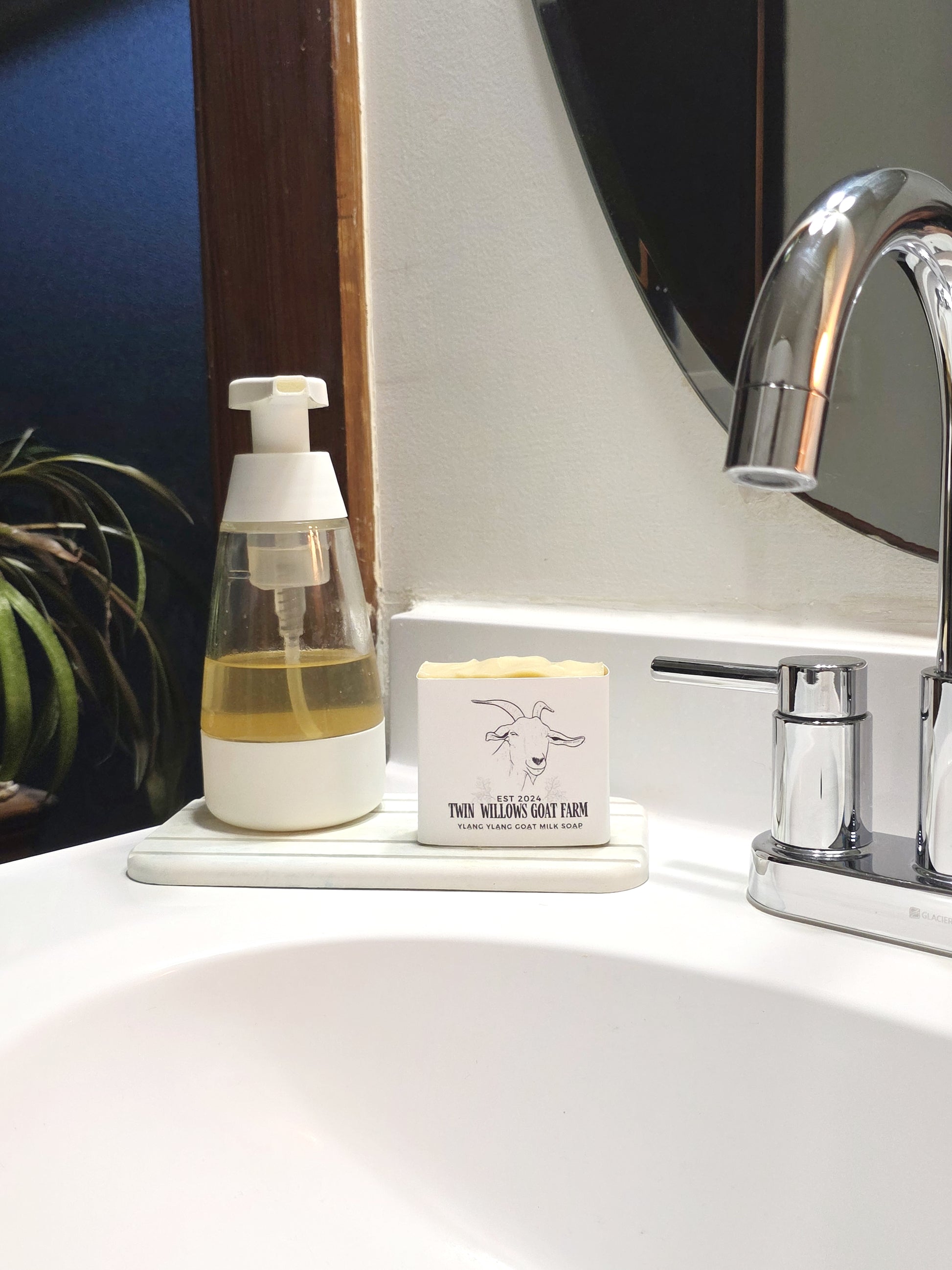 Made with: Goat Milk, Olive Oil, Coconut Oil, Sodium Hydroxide (lye), and Ylang ylang Essential Oil.
